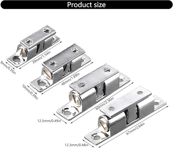Upgrade your cabinet doors with this 12-pack of Double Zinc Alloy Spring Ball Latches, designed to provide a secure, quiet, and smooth door-closing experience. Each latch features adjustable tension, allowing you to customize the tightness to fit different cabinet door thicknesses and ensure a perfect closure every time.