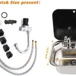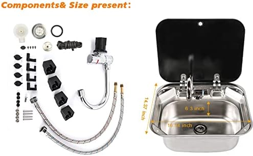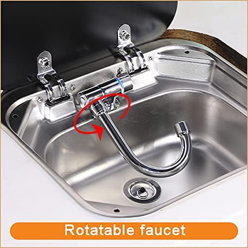 The sink measures 42 × 37 × 16 cm (16.54″ × 14.57″ × 6.3″) with a thickness of 0.8 mm, providing a practical depth for washing dishes or preparing food in limited spaces. The included hot and cold water faucet features a 360° rotating spout, making it highly functional for RV and caravan use.