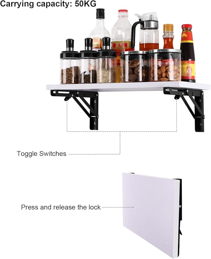 These folding shelf brackets are made of premium cold-rolled steel with a brushed finish that resists scratches, corrosion, and daily wear. They maintain a clean, modern appearance over time. Note: Shelves shown are for demonstration only and are not included.