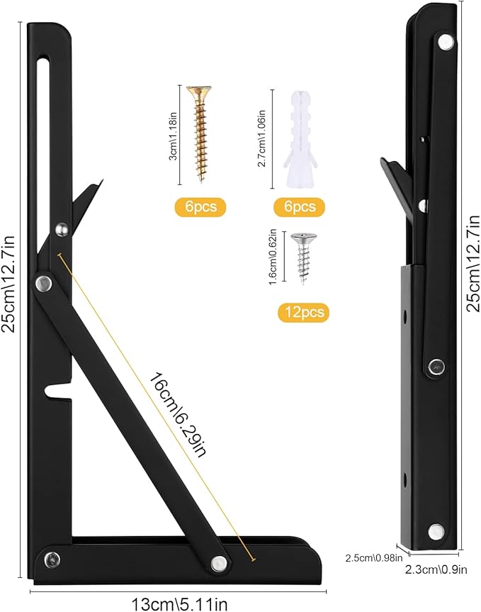 Simple to mount and fold, these brackets allow you to easily create a foldable shelf or wall-mounted table for your home, office, or garage. They can be installed on most wall types without damage. Each set includes 6 stainless steel screws and 6 expansion tubes for secure installation.