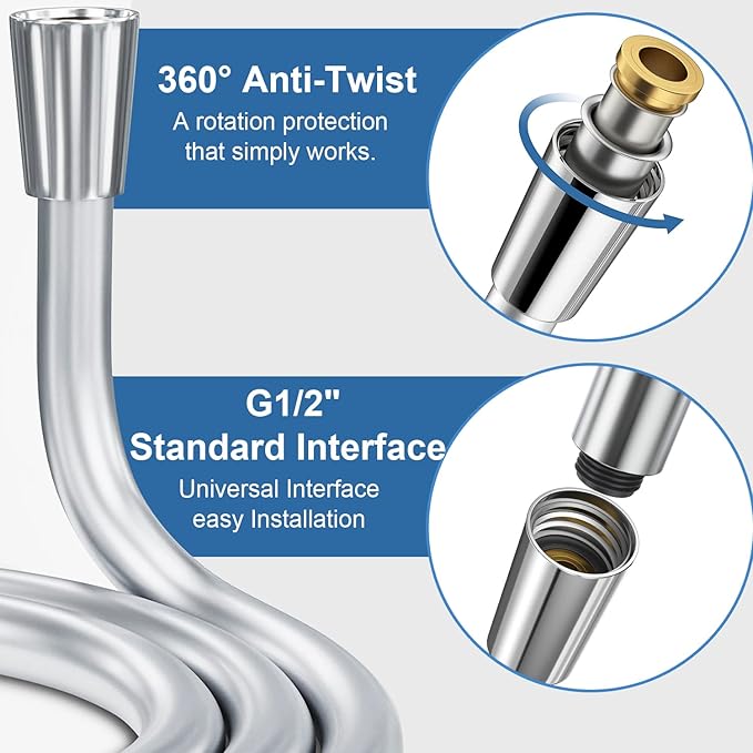 The hose is easy to clean and maintains a smooth, hygienic surface even after repeated use. Thanks to the 360-degree rotating outlet connection, the hose prevents twisting and tangling, ensuring a comfortable and hassle-free shower experience.